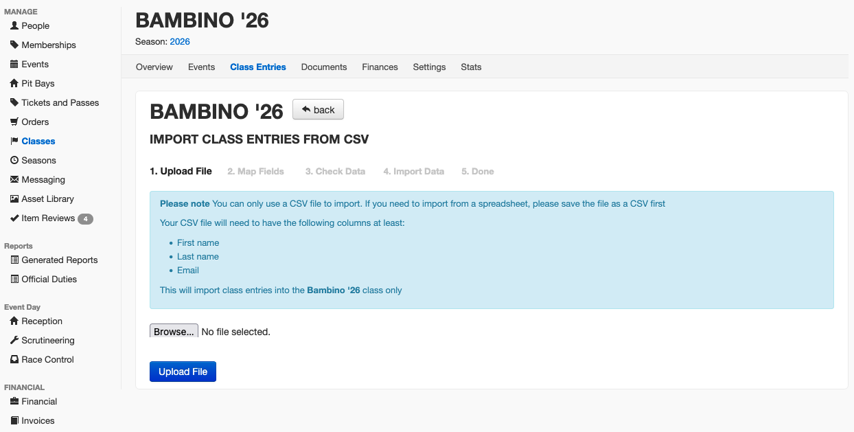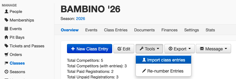 If you have already taken your Class Registrations or need to import the drivers for a visiting series, contact the Support Team who can enable the option to import Class entries.