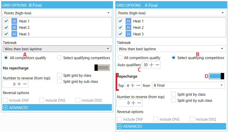 The Grid Options for the B Final in this example have the Grid type as Points with the selected sessions to count. Make sure that it is set to "All competitors Qualify" (A).