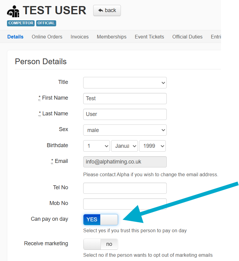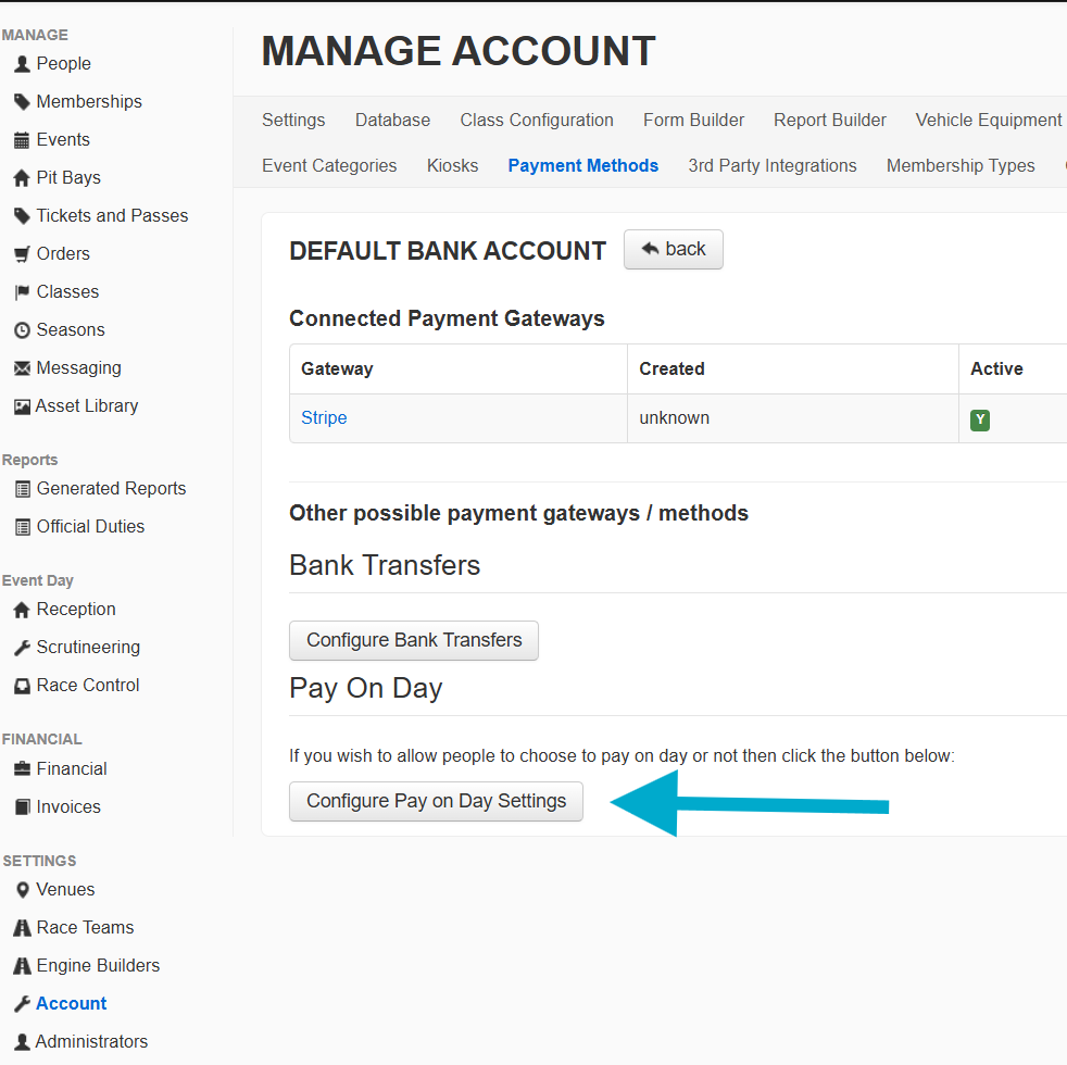 If you'd like drivers to be able to enter or reserve tickets, but then pay on the event day, this option can be enabled in your Payment methods. This can be restricted to certain customers (enabled on their People profile) or to be used just for ticket purchases. You can also specify the wording on the pay button, if you want to direct them where to go, on the day, to pay.