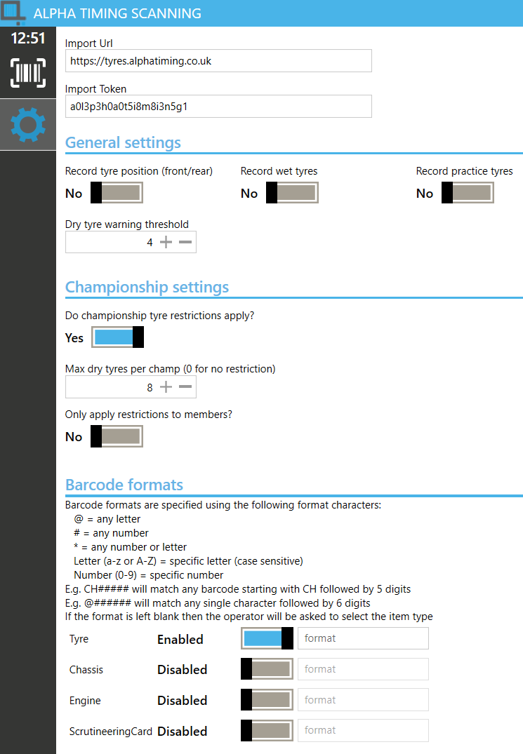 | The import URL and import token will be provided to you from the Support Team. These should not be changed after installation. General Settings In the General Settings you can set whether to record the position of tyres, wet tyres or practice tyres. You can also set the warning threshold for the scanners. Championship settings If you applying restrictions for a championship, you can set the maximum number of race tyres permitted (wets and practice tyres will be excluded). You can also choose whether to only apply these restrictions to members. Barcode Formats By default the scanning app will record all barcodes as tyres. However, if you are scanning other items, you can create a specific format for these barcodes so the scanning system can recognise them, and not as them as a tyre. | ![]() |